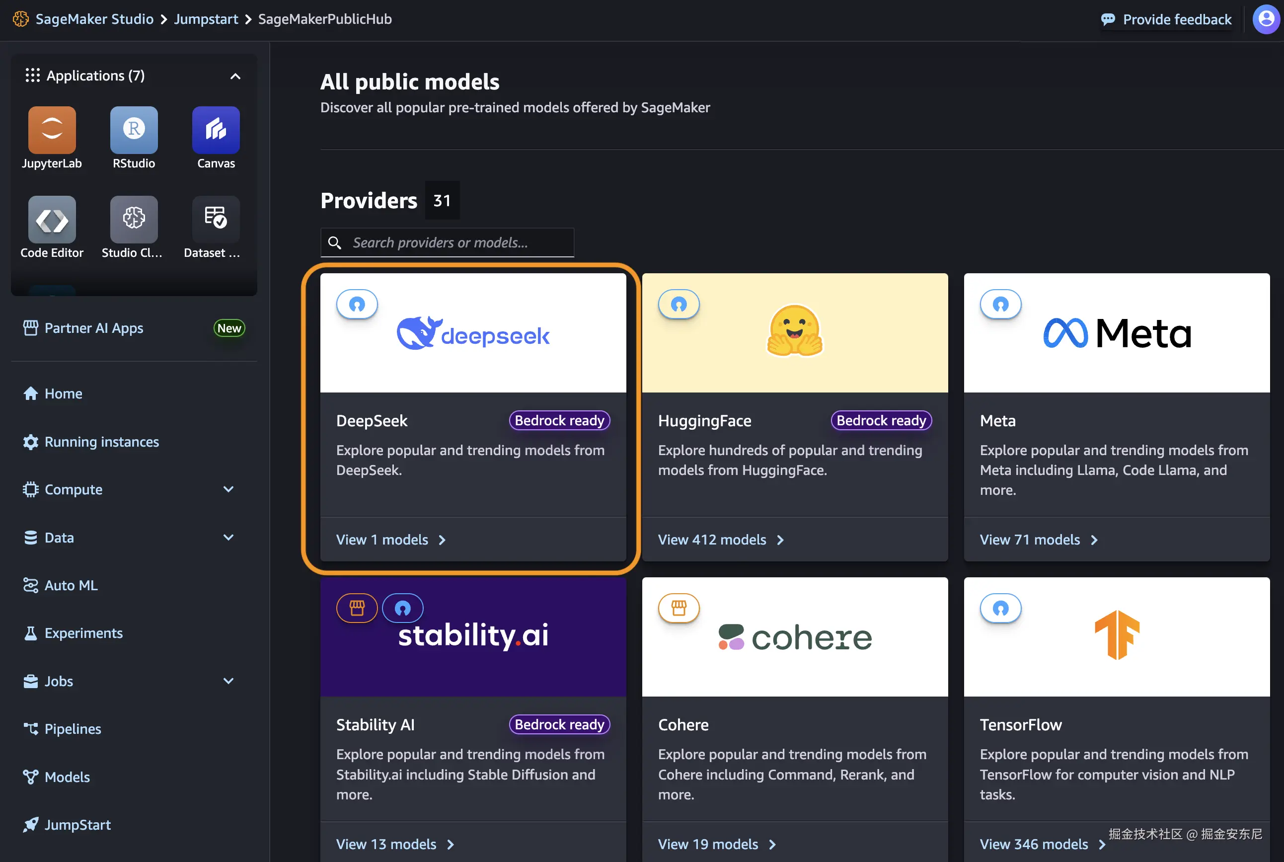 在 SageMaker Studio 控制台里就能找到 DeepSeek-R1,点几下就能创建 endpoint。还可以接入 SageMaker Pipelines 做训练链路管理,用 Debugger 看性能分析、加上日志追踪,适合做更精细化管控的团队。