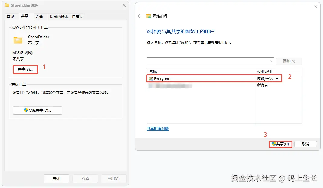 在 Windows 系统中共享指定的文件夹。通常使用 Windows 主机用户名和密码来登录更为安全,但在实际验证过程中发现,由于用户名或密码中可能包含特殊字符,容易导致各种问题。为了简化验证过程,这里直接使用 Everyone,跳过用户名的要求。具体操作步骤如下:右键点击要共享的文件夹(如 ShareFolder),选择“属性”,然后点击“共享”标签页,接着点击共享按钮,选择添加 Everyone,并修改权限级别为“读取/写入”,最后点击共享按钮使设置生效。