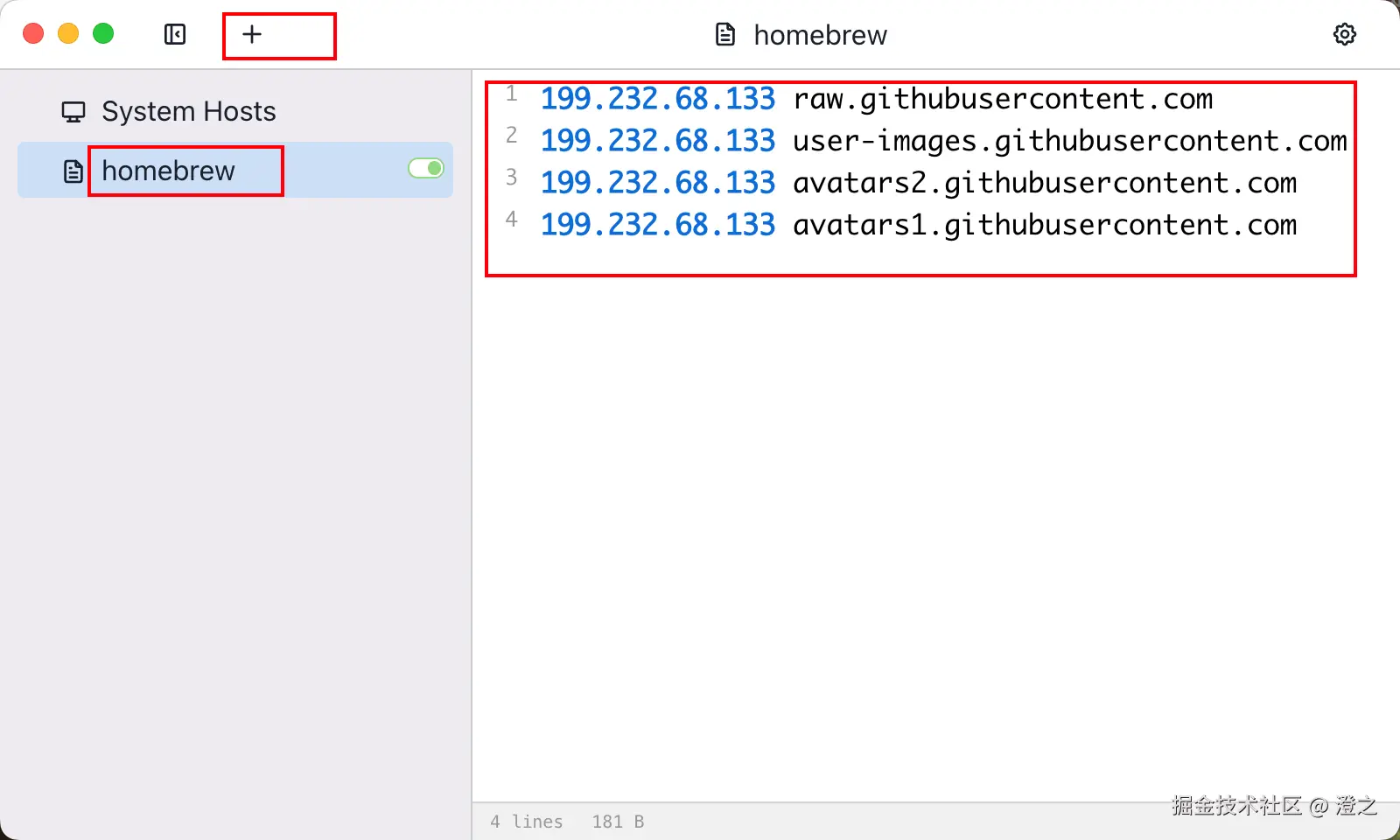 打开swithchosts,添加一条,并加入以下配置(为了后续下载homebrew)