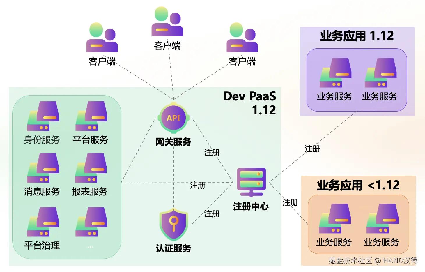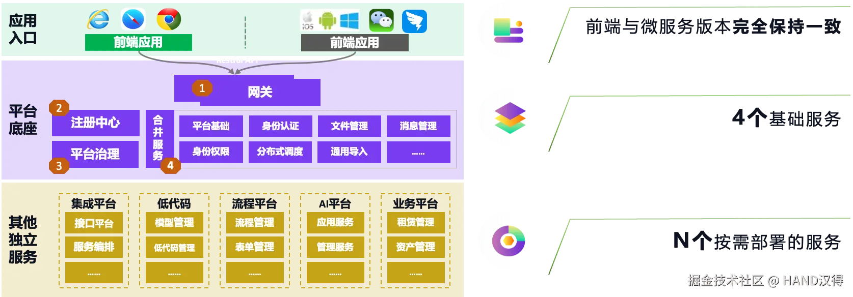 基础平台微服务数精简到4个服务,实现4+N的架构,针对轻量级应用节约部署资源50%+