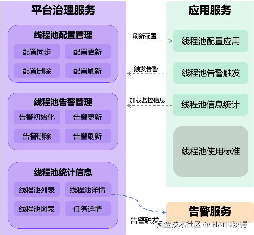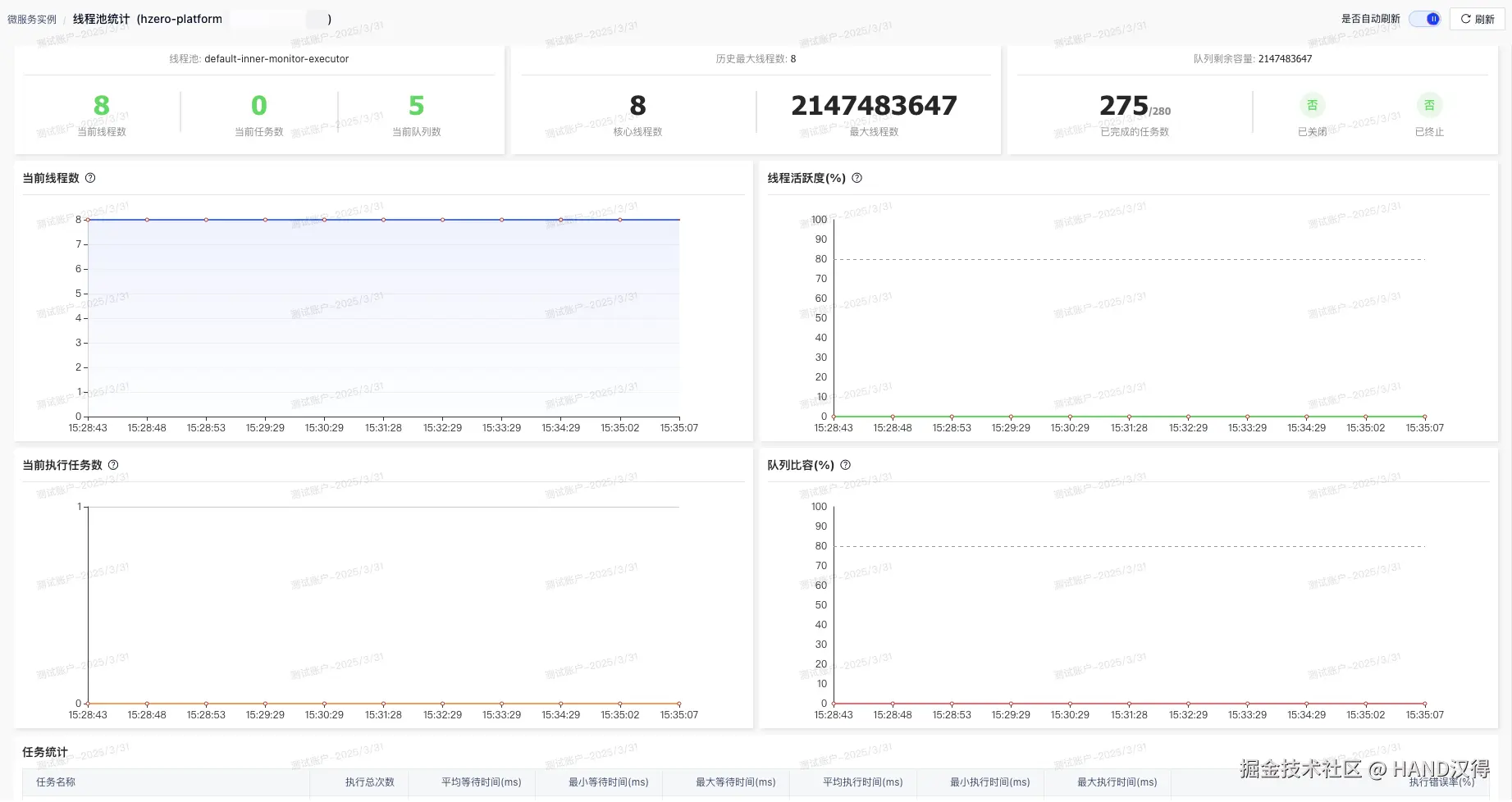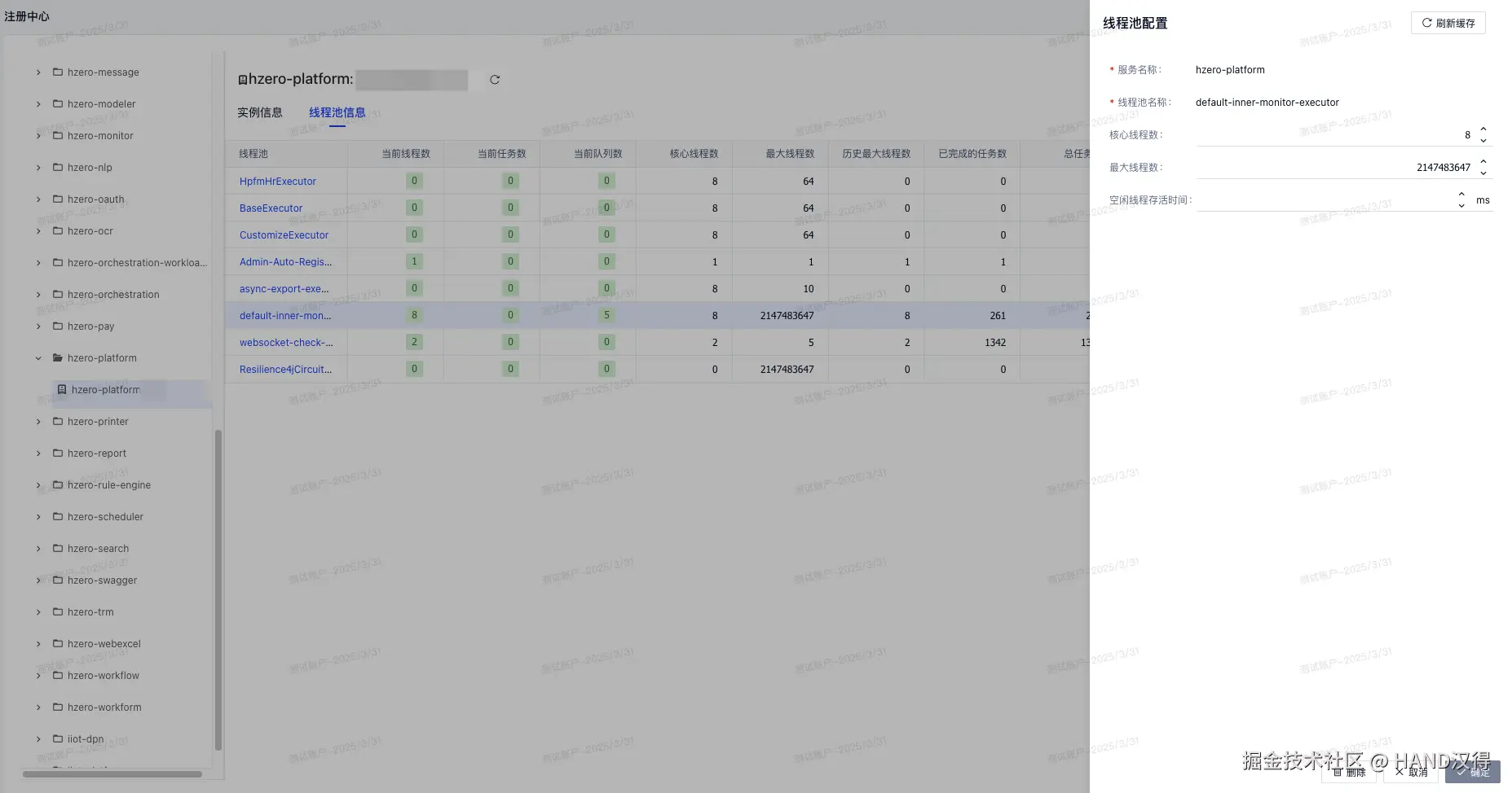 为了解决服务存在大量异步线程任务运行状况难以便捷监控干预问题,平台推出了线程池管理功能,全时态监控可视化,动态策略秒级生效,智能阈值精准预警。