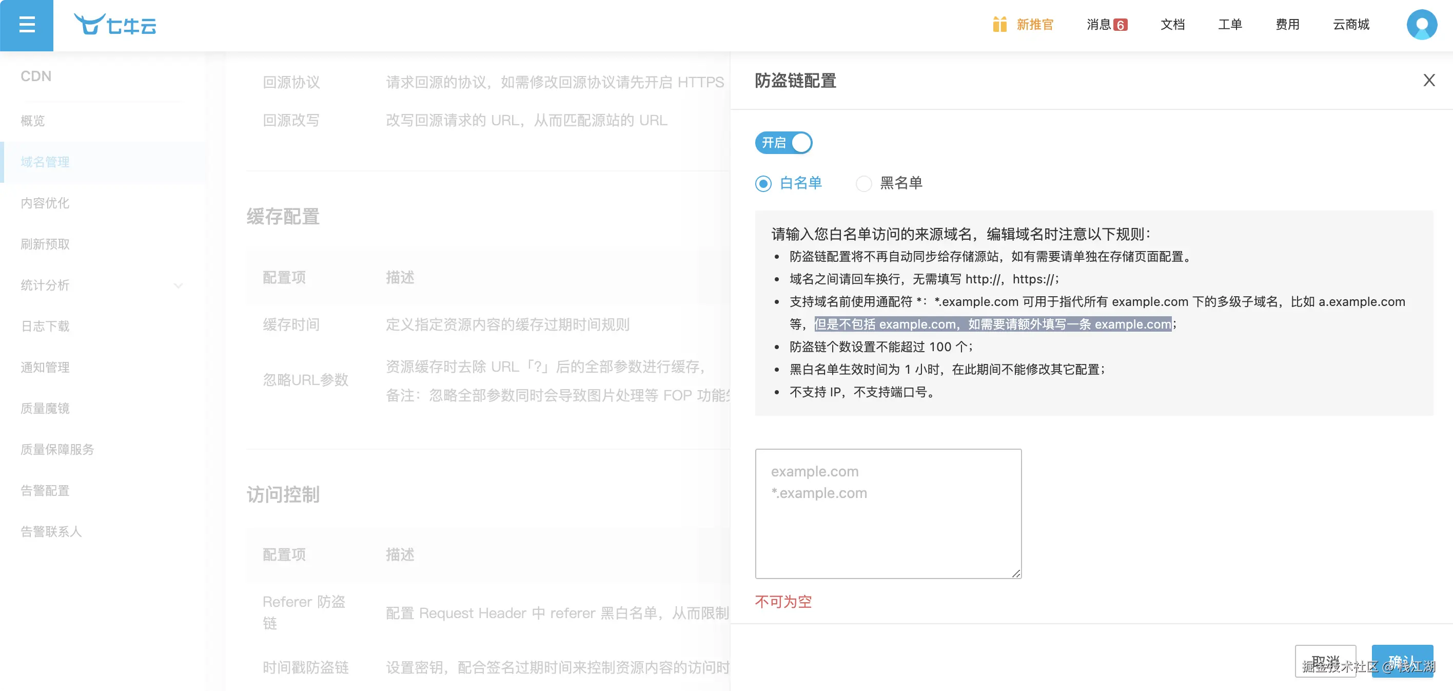 七牛云的 Referer 防盗链 是一种常见的防盗链机制,用于限制资源的访问来源,防止资源被非法引用或盗用。通过配置 Referer 防盗链,可以确保只有指定的域名或来源才能访问资源,从而保护流量和数据安全。