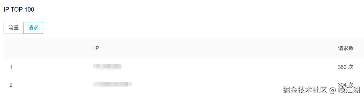 这里可以看到单个 IP 流量和请求数 top 100 的数据。把前面几个异常 ip 设置到黑名单。