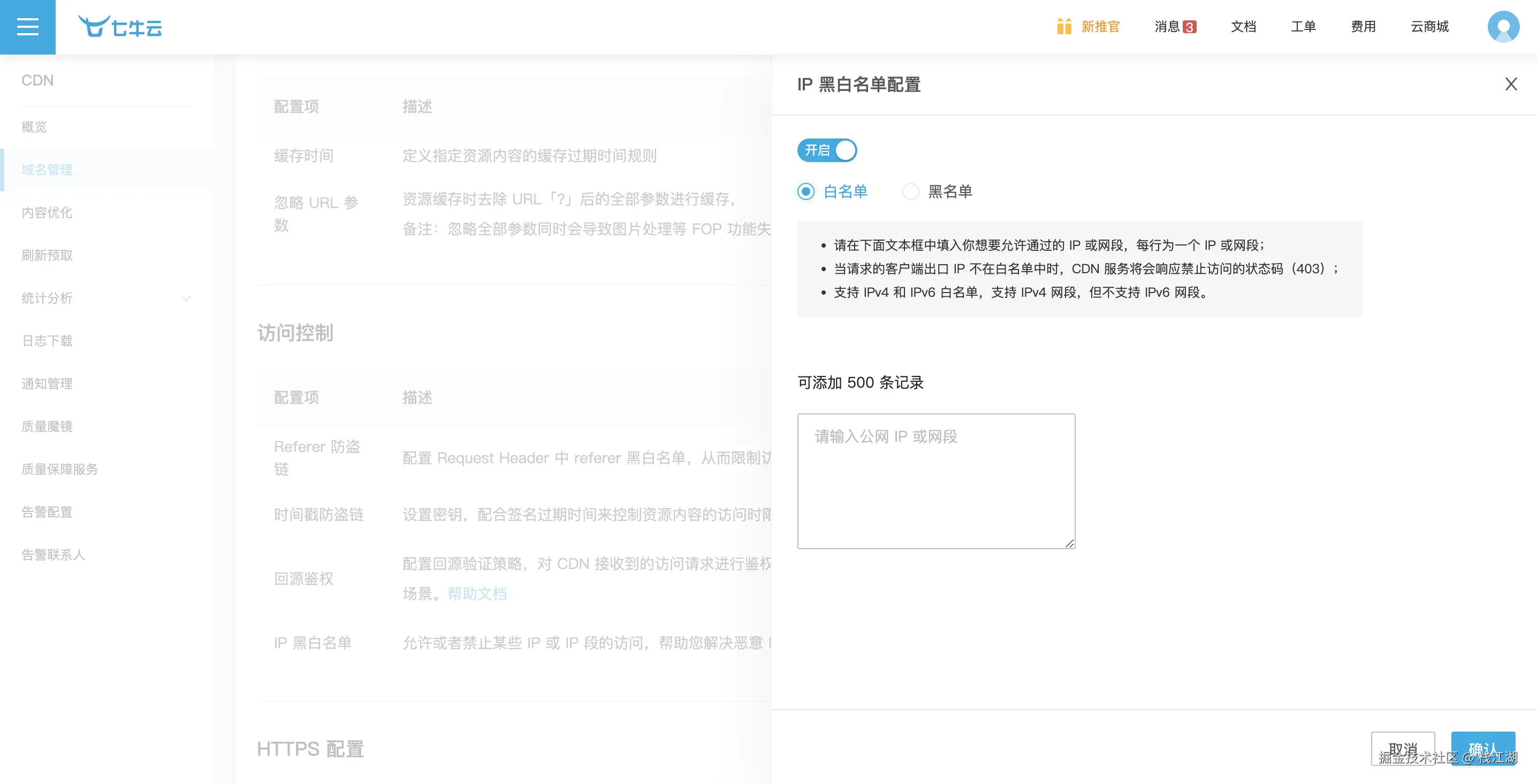 CDN控制台->域名管理->配置-> IP黑白名单配置