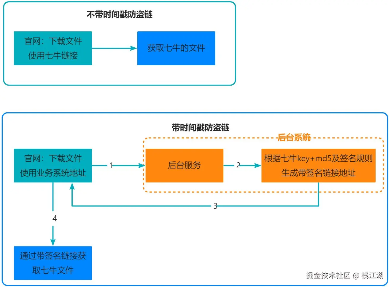 就是增加了后台系统这部分,把原始地址通过签名规则生成相应带签名的下载地址,这样这个地址就带了时效性,过期就失效了。