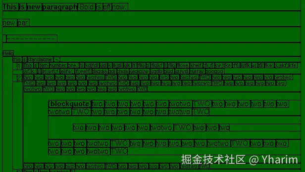 你可以将任何文本(或HTML)分割成小的片段。我们把这些片段称为单元格。例如,一个单词、一条水平线、一张图片或者文档的任何其他部分都可以是一个单元格。每个单元格都有宽度和高度(特殊的零尺寸 “神奇” 单元格除外,比如颜色更改器或字体更改器)。详见HtmlCell。