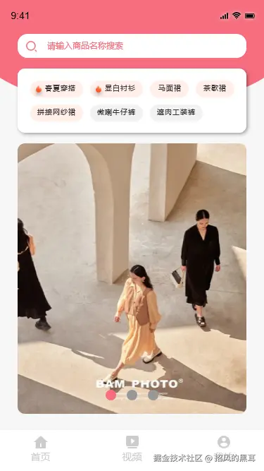 - Axure实现:在页面顶部添加搜索框,用户可输入商品名称进行搜索。在搜索框下方展示热搜词,如“春夏穿搭、显白衬衫、马面裙...”,使用文本链接组件,点击热搜词可跳转至相应的商品列表页面。使用动态面板或中继器组件创建轮播图,展示商品系列或品牌的宣传海报,设置轮播效果,点击海报可跳转至具体品牌店铺页面。底部导航菜单使用按钮组件,设置“首页”“视频”“我的”三个按钮,点击按钮可跳转至相应的页面。