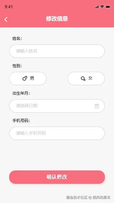 - Axure实现:使用文本框组件创建姓名、性别、出生年月、手机号码等输入框,设置合适的字体和大小。添加保存按钮,设置点击事件,模拟保存修改信息的操作。