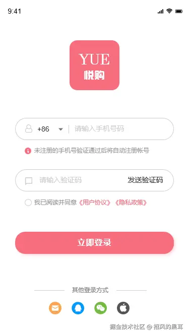 - 设计思路:以简洁明了为原则,突出手机号码验证码登录方式,同时提供其他登录方式入口,满足不同用户需求。