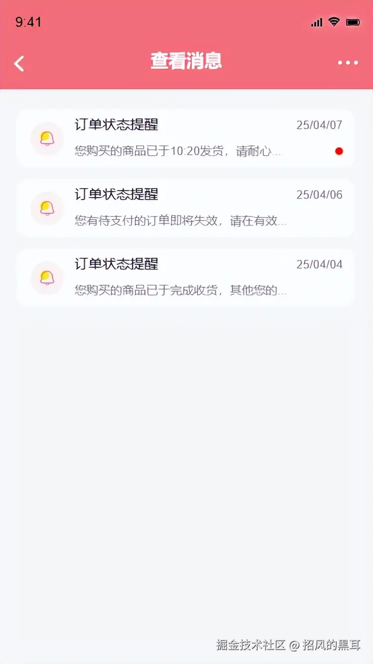 - Axure实现:使用列表组件展示消息,每个列表项包含消息类型、日期时间、消息内容缩略显示,未读消息以小红点标记。点击单条消息可跳转至详情页面,如点击订单状态消息,进入订单详情页面。在消息列表头部右侧添加更多图标,点击图标下拉显示全部阅读、清空消息选项,设置相应的交互事件。