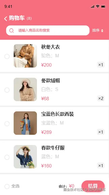 - 设计思路:列出用户加购待付款的商品,提供商品名称搜索、按价格和数量排序展示、单选或多选商品结算等功能。