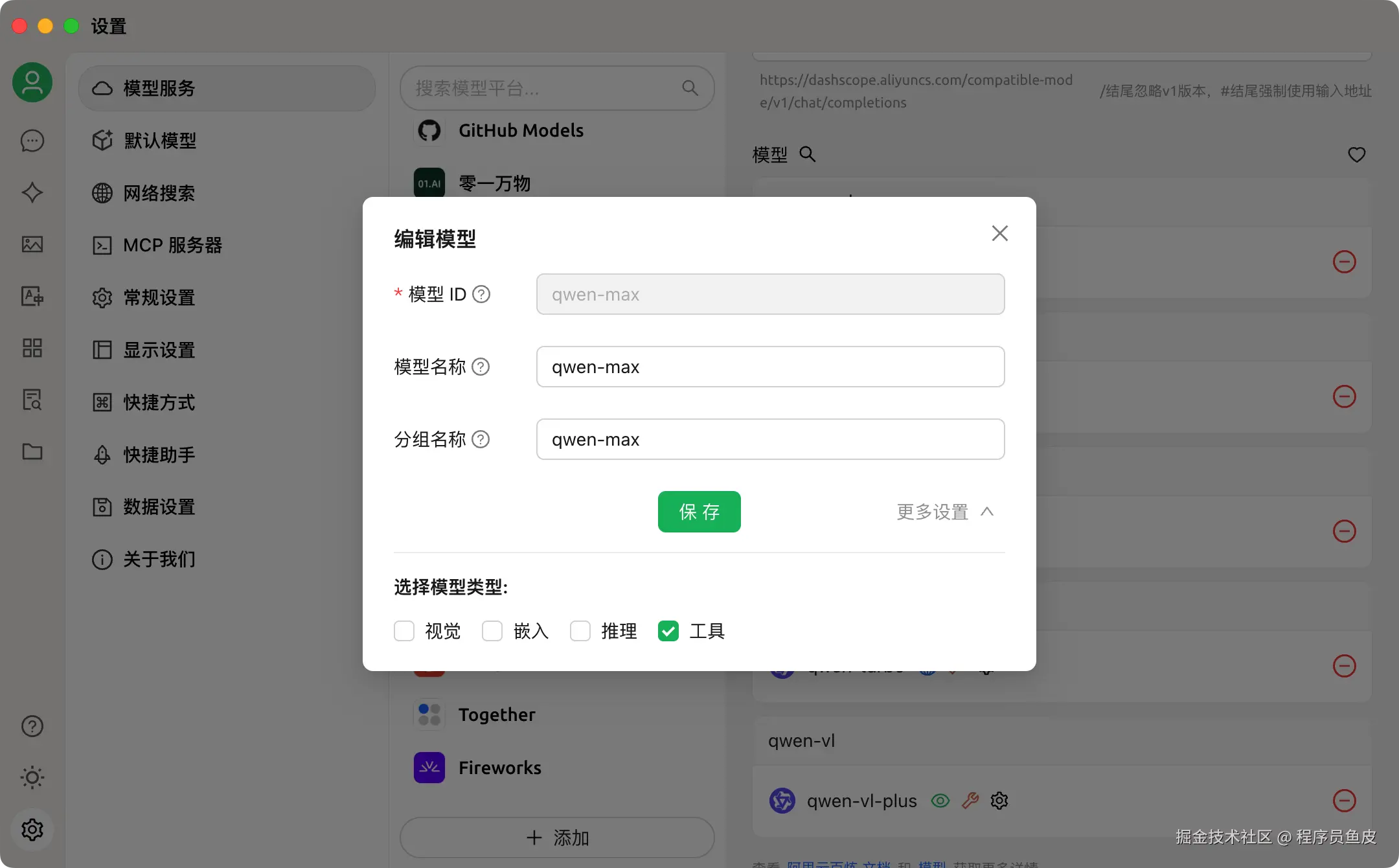 3、在 “设置 => 模型服务” 里选择一个模型,输入 API 密钥,选择模型设置,勾选下工具函数调用功能: