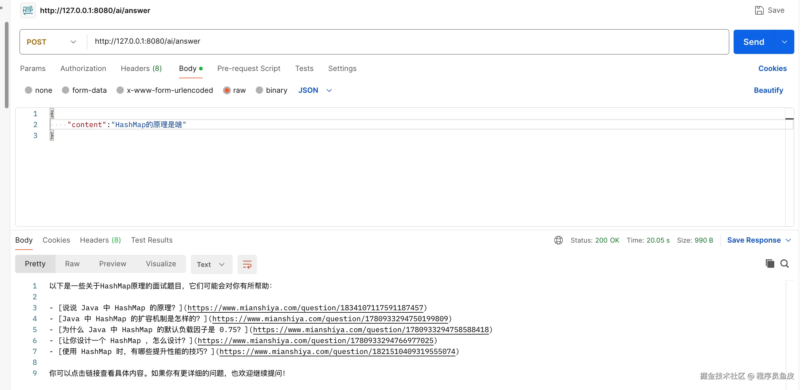 最后测试一下,输入面试题目 “HashMap的原理是啥”,就会返回 面试鸭 的题目以及链接。