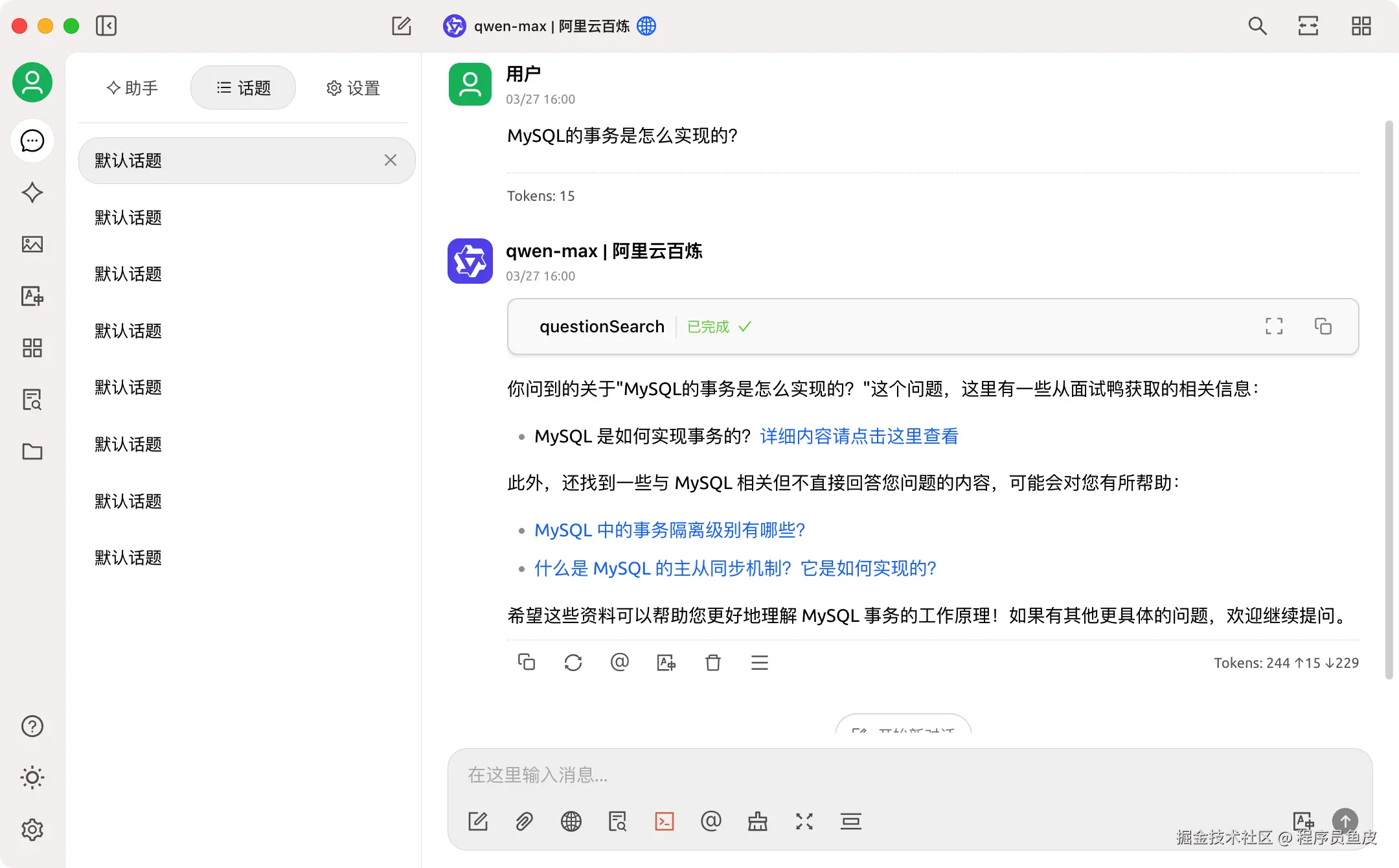 直接调用ChatClient,将面试问题输入给AI即可,也不需要写过多的 prompt,因为在 MCP 服务端的工具描述中,已经写的比较详细了 —— 比如用户想要搜索技术面试题,就会自动调用刚刚写的工具。