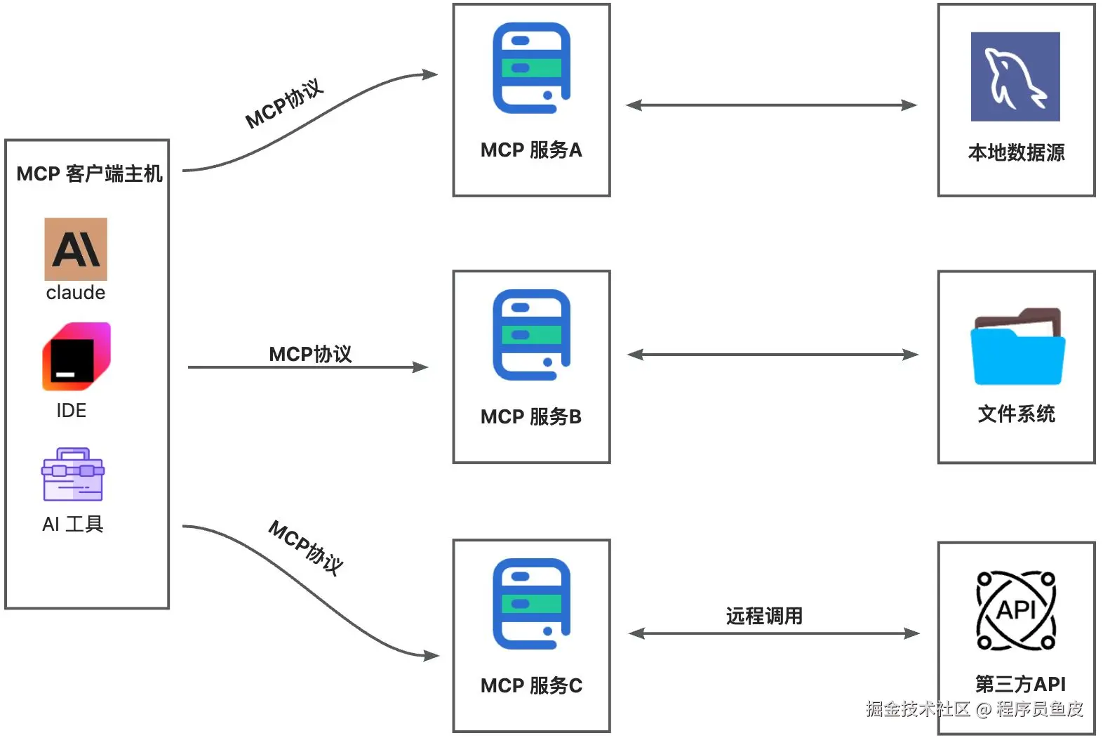 MCP 的核心是 “客户端 - 服务器” 架构,其中 MCP 客户端主机可以连接到多个服务器。客户端主机是指希望通过 MCP 访问数据的程序,比如 Claude Desktop、IDE 或 AI 工具。