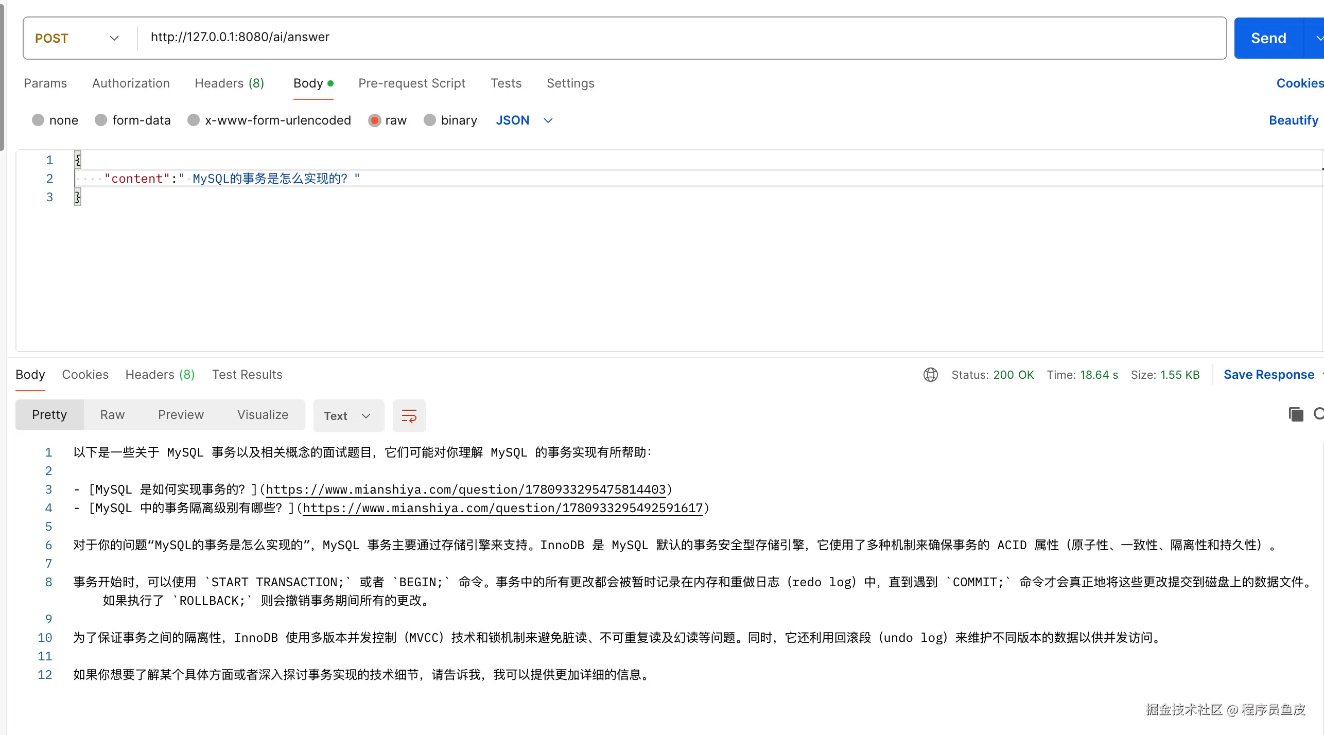最后测试一下,输入面试题目 “MySQL的事务是怎么实现的?”,就会返回 面试鸭 的题目以及链接等。
