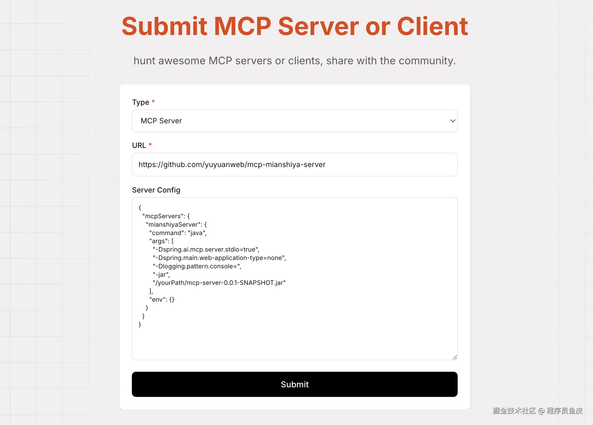 直接点击头像左侧的提交按钮,然后填写 MCP 服务的项目地址、以及服务器配置实例,点击提交即可。