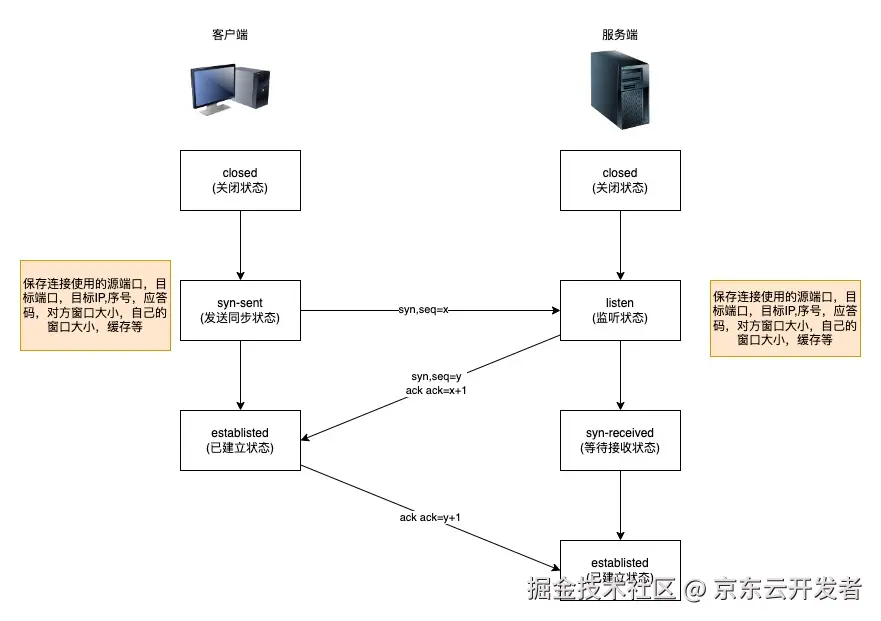 5.客户端收到服务端确认后,状态变更为已连接,客户端也需要给服务端回复确认收到,此时应答码为服务端确认码y+1。