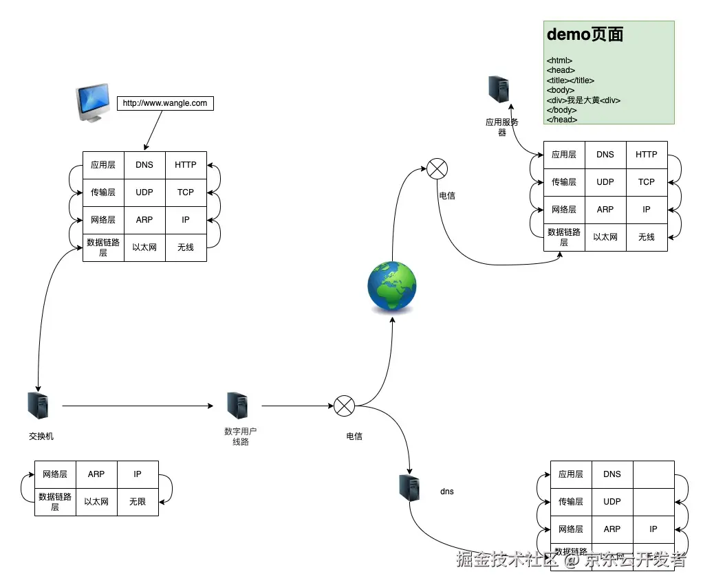 7.运营商判断如果非DNS请求,那么电信会通过运营商直接的协议进行消息的发送,最终找到ip对应的服务器。