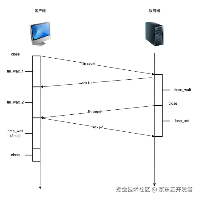 4.客户端收到关闭请求后,给服务端回复确认关闭应答消息,服务端关闭,客户端处于等待状态,此时需要等待两个最大请求时长(防止服务端由于网络原因未收到应答消息,服务端会重试发送FIN消息)。