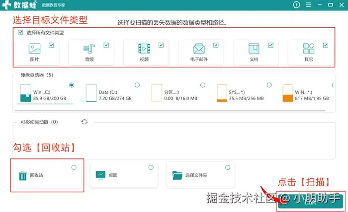 步骤1: 在软件首页上根据指示选择自己需要恢复回来的文件类型,再勾选左下方的【回收站】,选择后点击【扫描】;