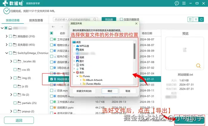 步骤3: 勾选后点击【导出】,再在【浏览文件夹】的弹窗中选择恢复文件的新存放位置。