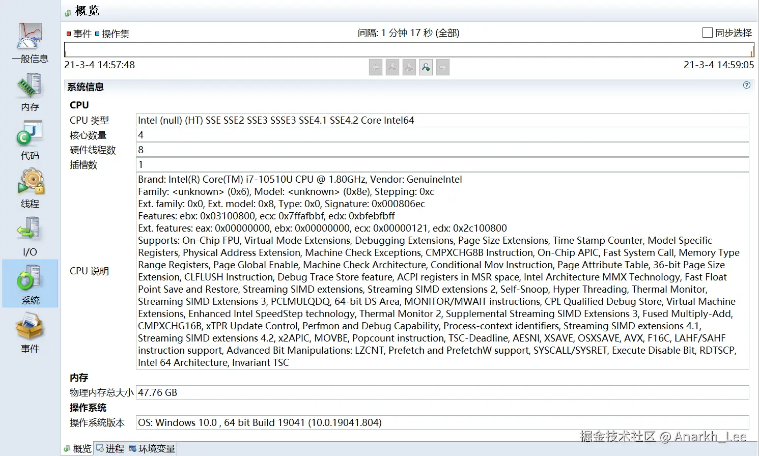 - 线程历史 Thread History:显示一个与线程活动和线程状态在一起的活动时间表。