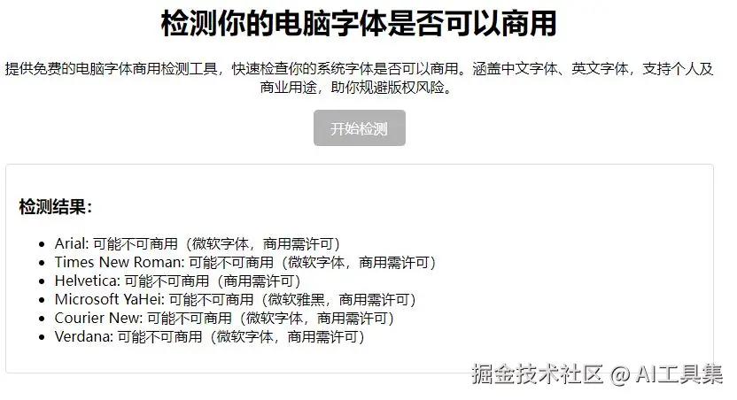 建议将其纳入你的「开发工具箱」,每次项目启动前花 3 分钟检测字体,就能避免 99% 的版权纠纷。记住:合规是项目上线的前提,也是对自己和团队的保护。