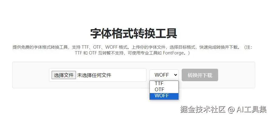 通过下拉菜单选择输出格式(TTF/OTF/WOFF),默认选中当前文件的原始格式