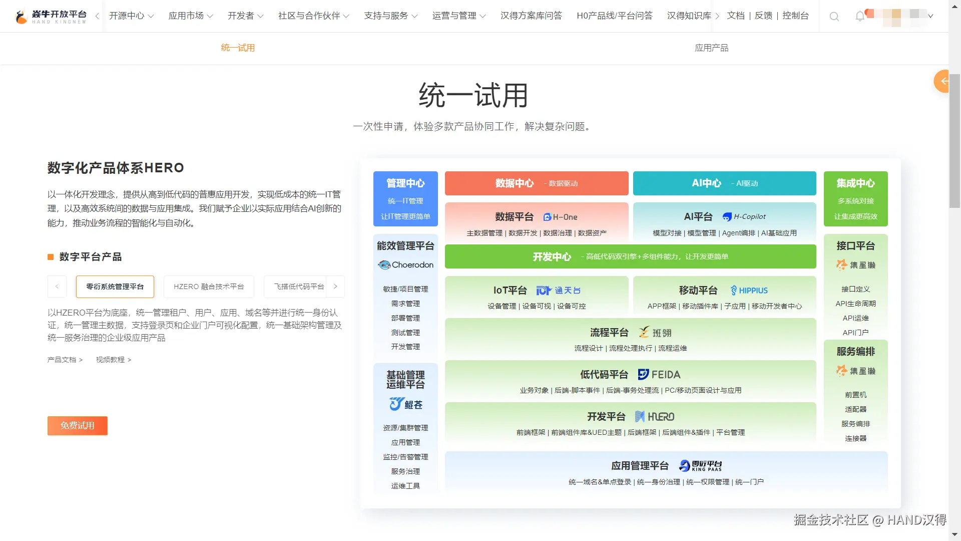 选择零衍系统管理平台并点击统一试用板块的“免费试用”