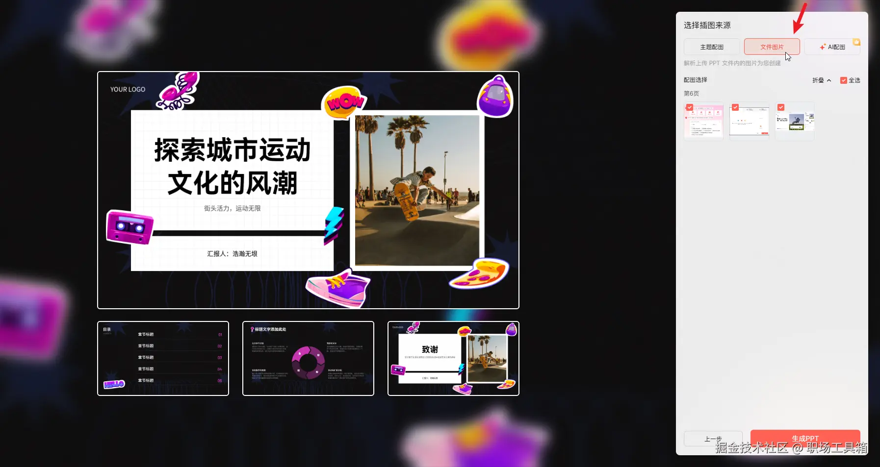 其次需要配置插图来源,即确定PPT页面配图的来源,如果上传的PPTX文件带有图片,可选择文件图片,使用美化前自带的图片,如果缺少图片,可选择主题配图或AI配图,使用当前模板预置的或AI生成的图片。