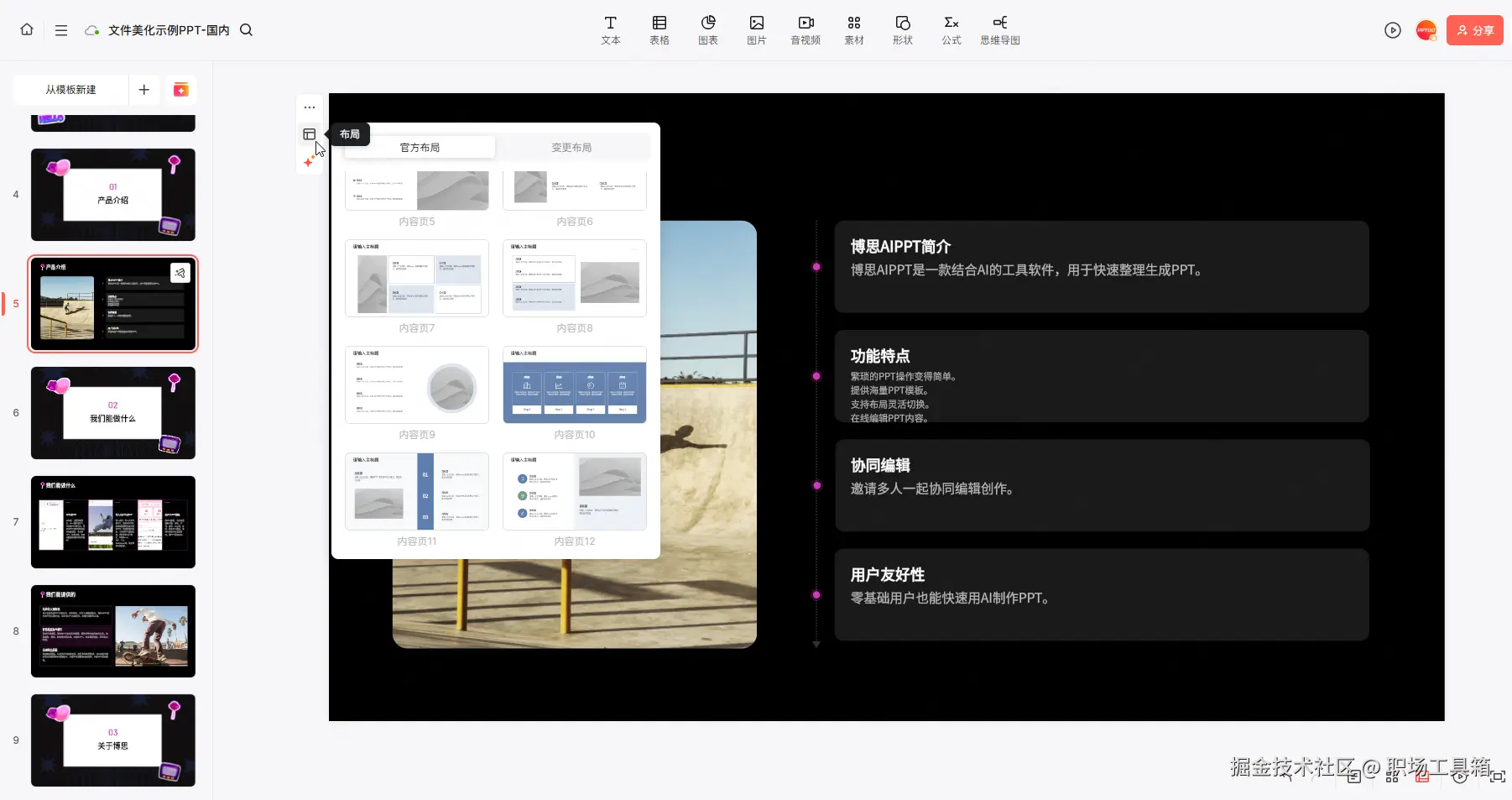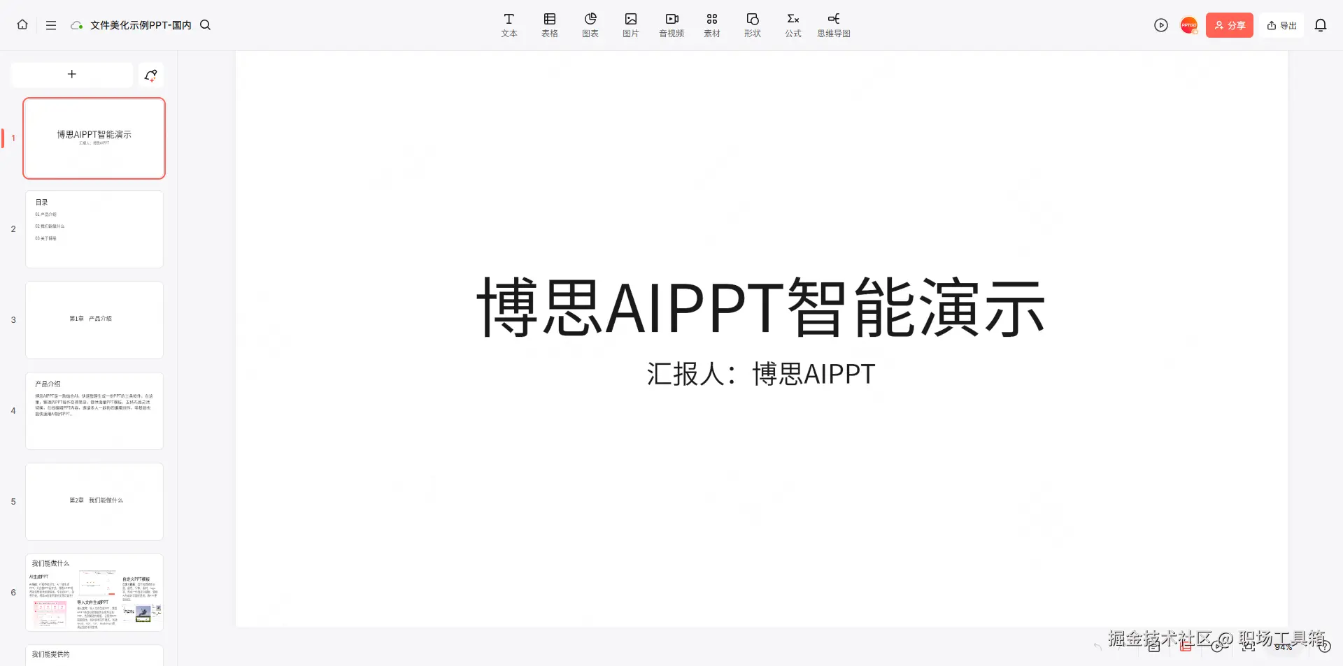 导入的PPTX文件,经过解析会转为博思AIPPT的云端文件,并自动打开博思AIPPT编辑器,如下图,博思AIPPT提供了多种编辑工具,支持在线协同编辑PPT。