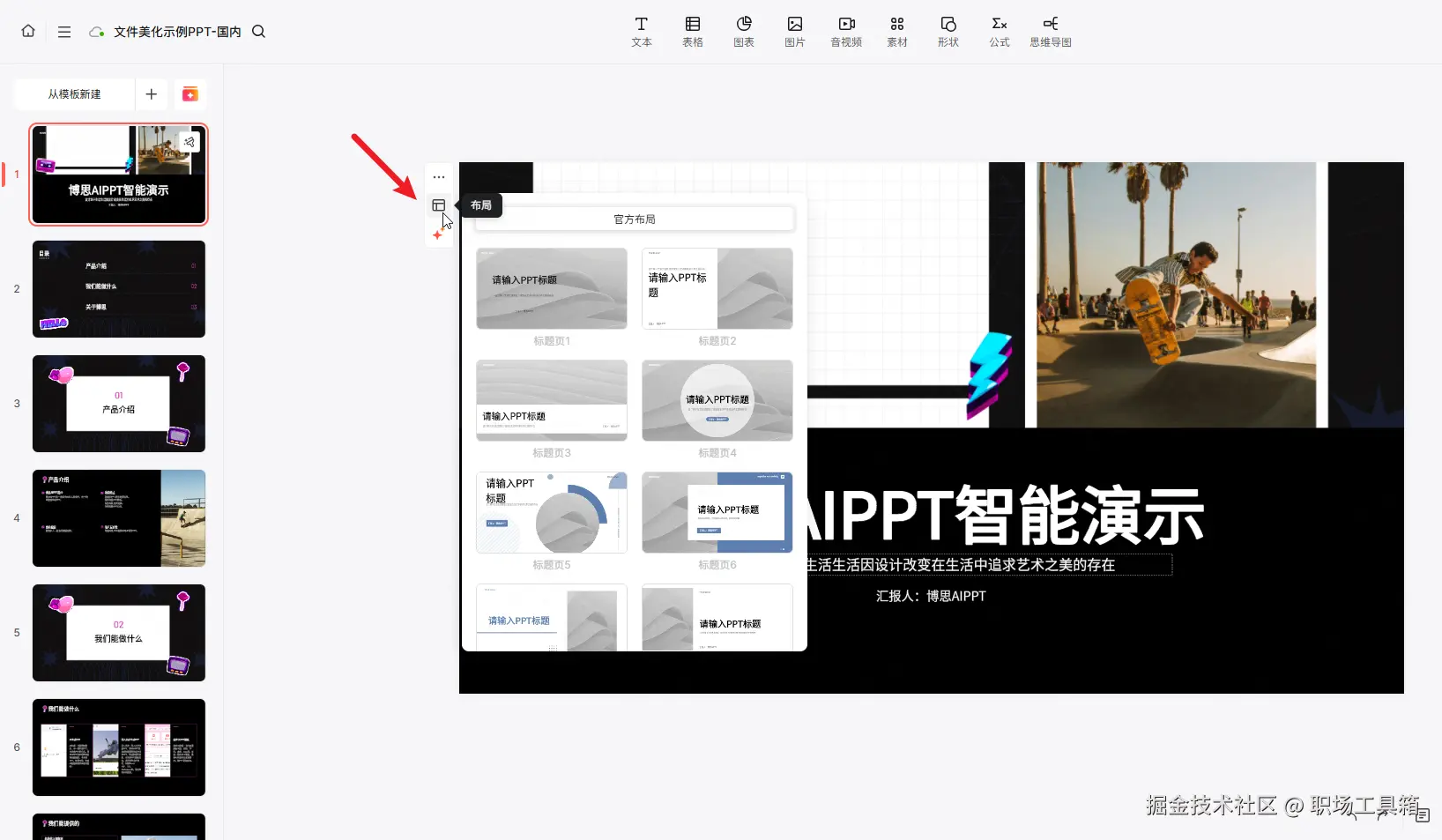 借助AI工具,布局调整变得简单高效。以博思AIPPT为例,在AI美化后,用户可以点击PPT页面左上角的布局选项,从弹出的布局面板中选择新的版式布局,一键完成整个页面的布局优化。这种智能布局功能确保所有元素位置合理,视觉效果协调统一。
