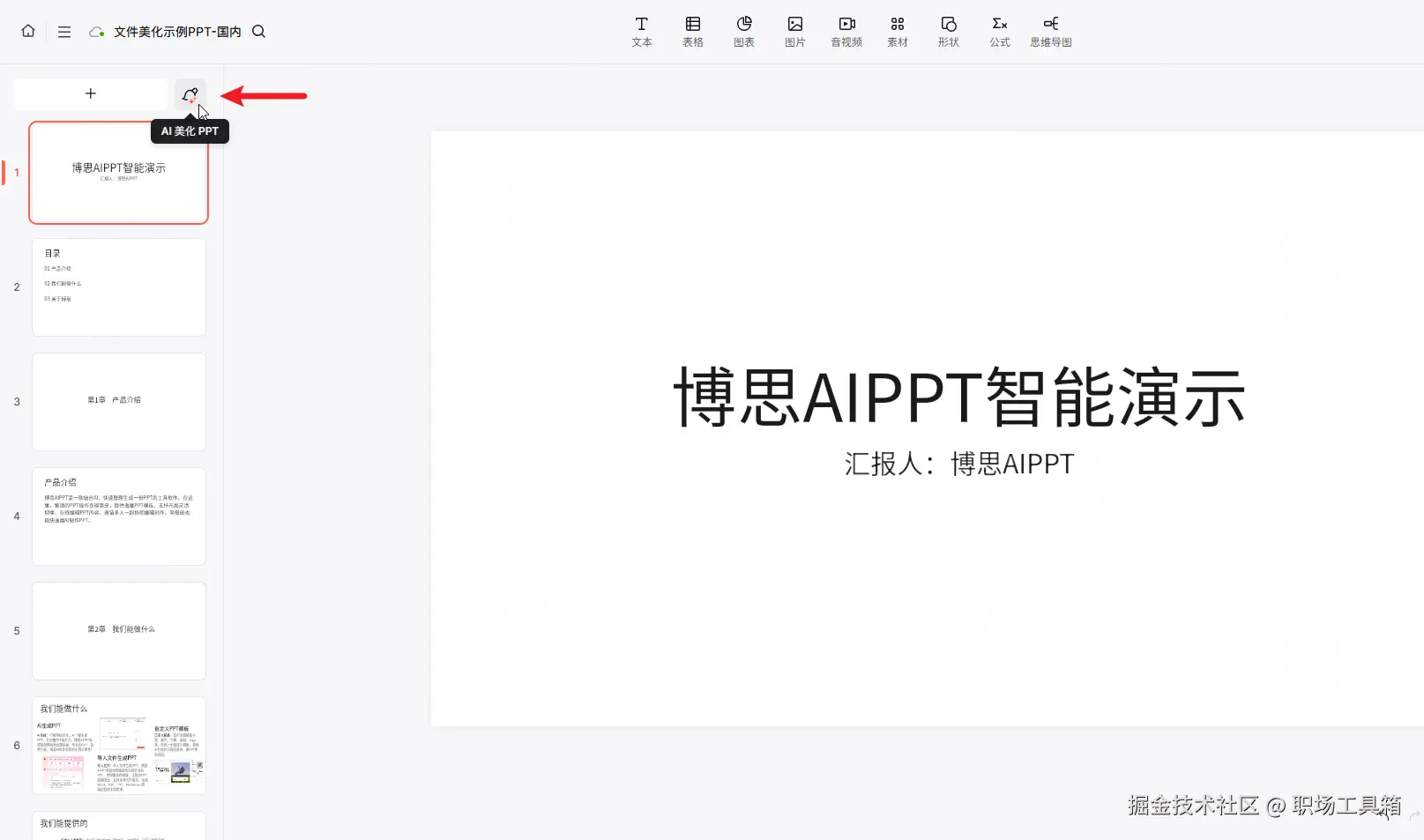如果无需编辑,可点击博思AIPPT编辑器左上角的AI美化PPT按钮,启用AI美化PPT。