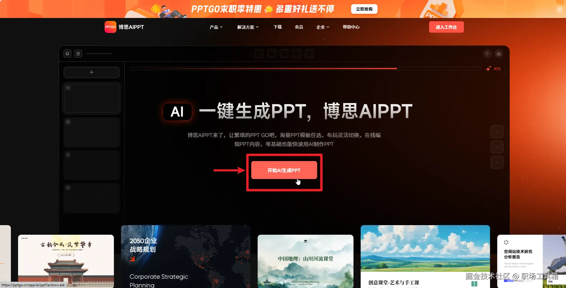 在电脑浏览器打开AI美化PPT工具“博思AIPPT” 的首页,如下图,点击“开始AI生成PPT”按钮,进入博思AIPPT工作台。