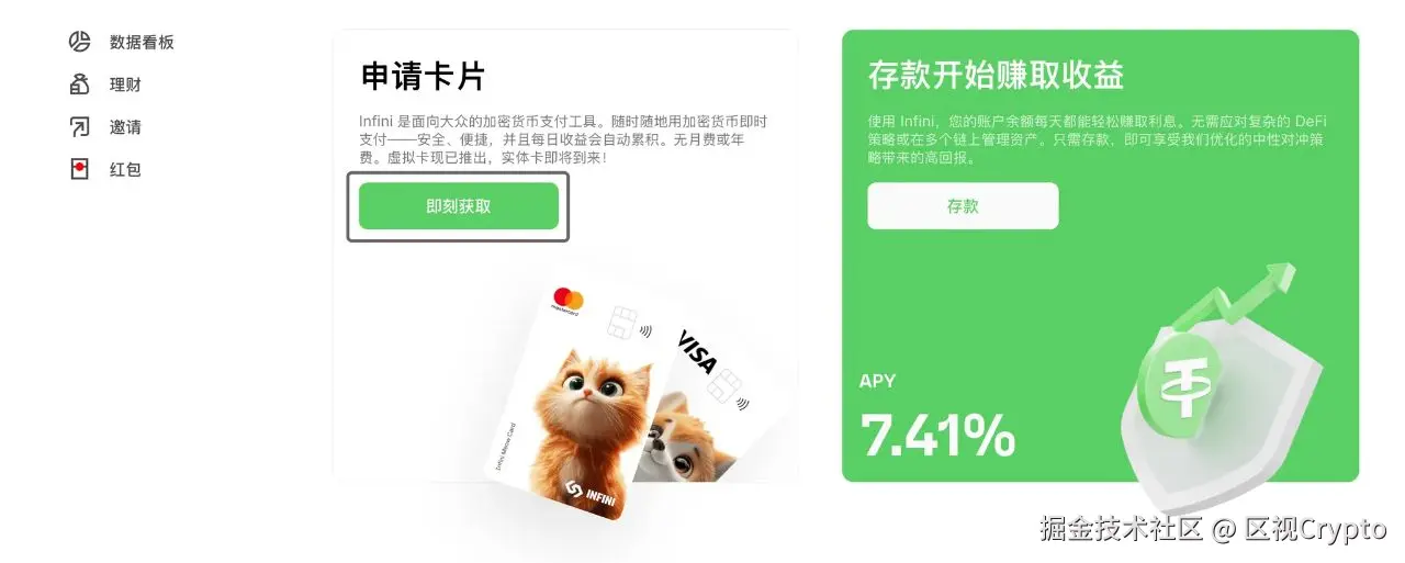 💳 infini 卡特点 • Visa Mastercard预付借记卡:充u即用 • 免KYC享$500消费额度:KYC后消费无上限 • 每日收益:web3余额宝,存u每日生息,APY 约4–10%