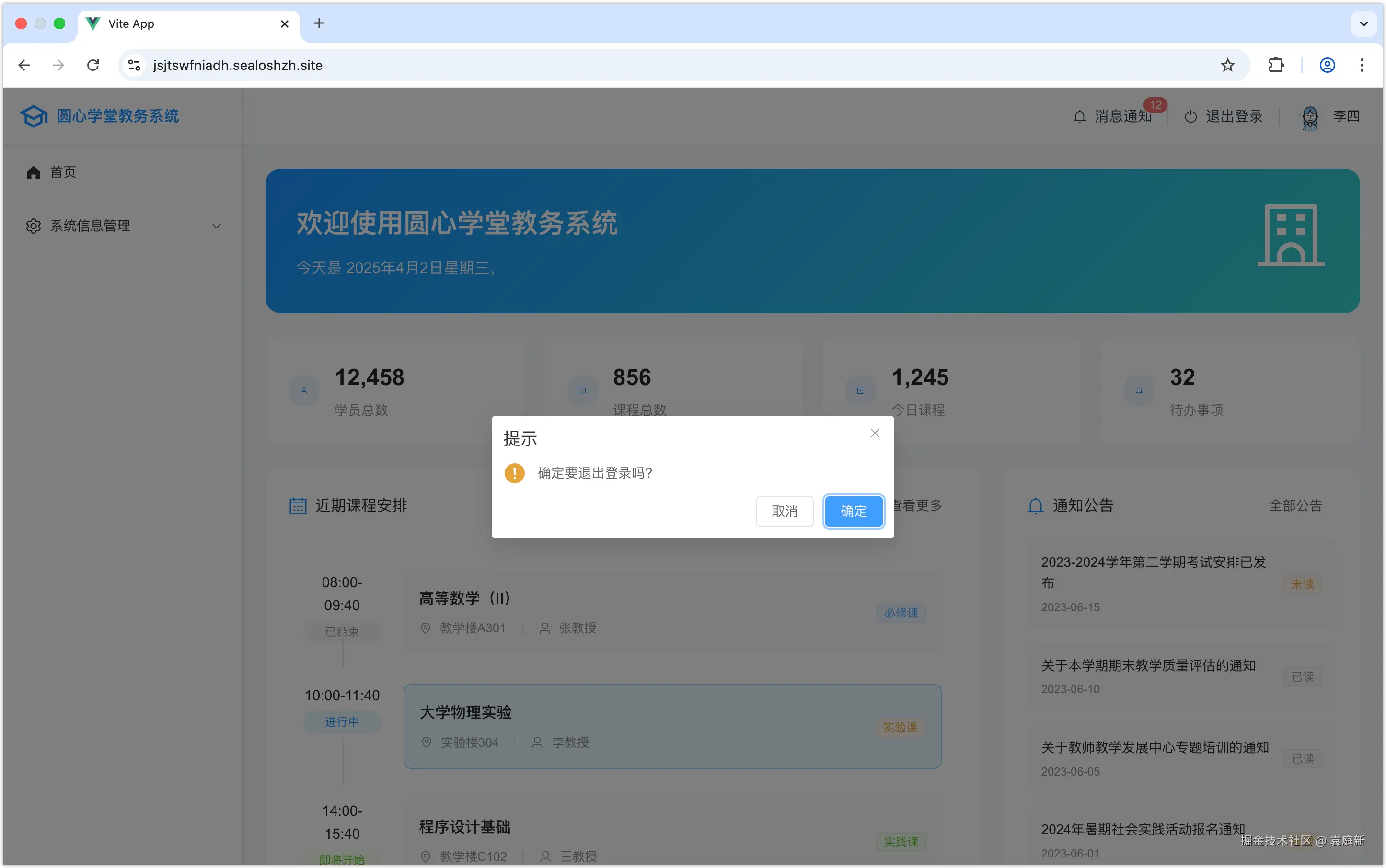 此时我们发现,右上角的用户信息也自动读取到了。点击「退出登录」按钮,会自动弹出下图所示的提示框,询问是否要退出登录。