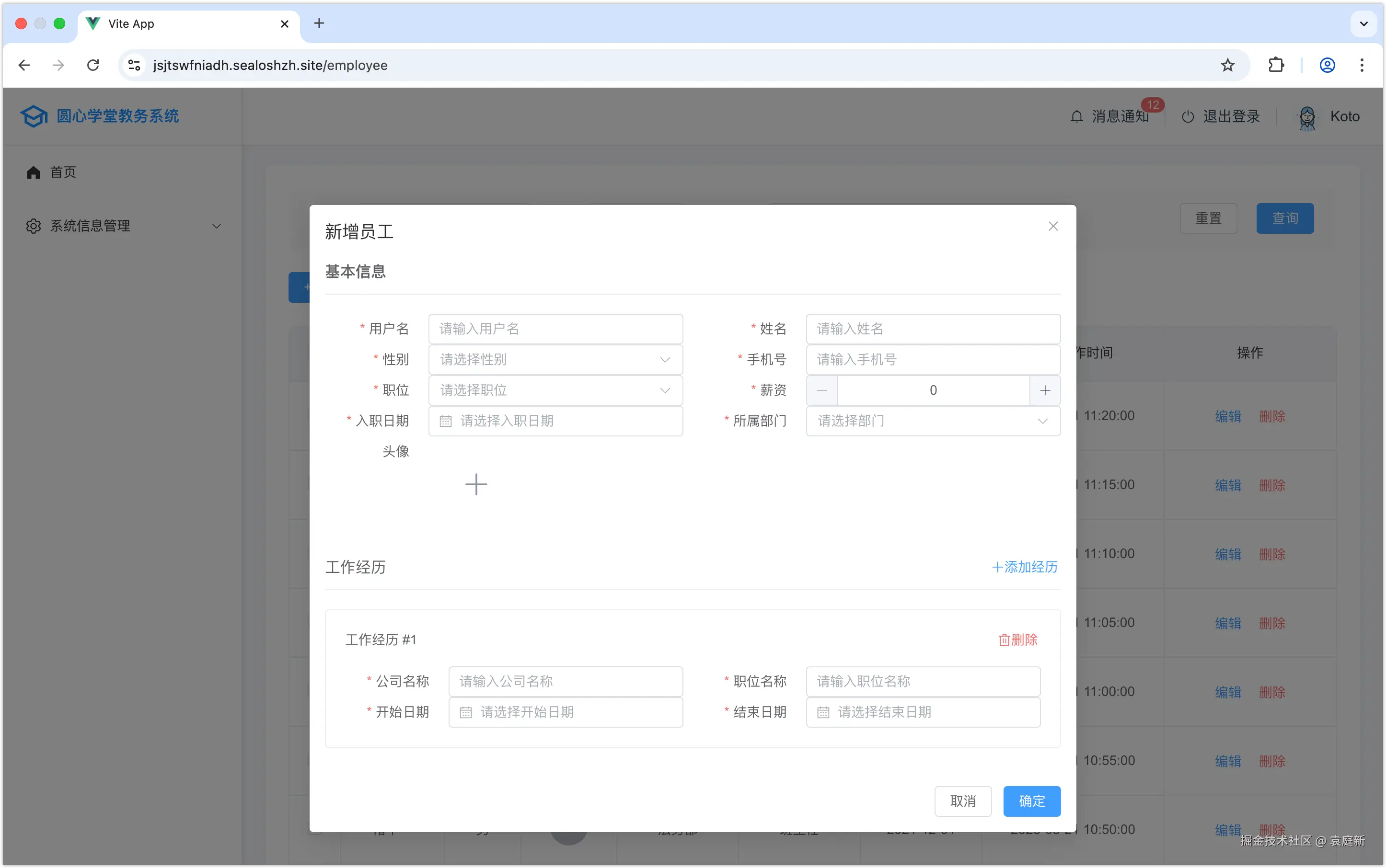 点击对应员工信息表中的「编辑」按钮,即可完成修改员工信息操作,并在打开的窗口中,自动回显了员工的数据。