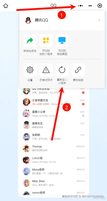 - 小程序 > 右上角三个点 > 重新进入小程序。如果无效再往下走