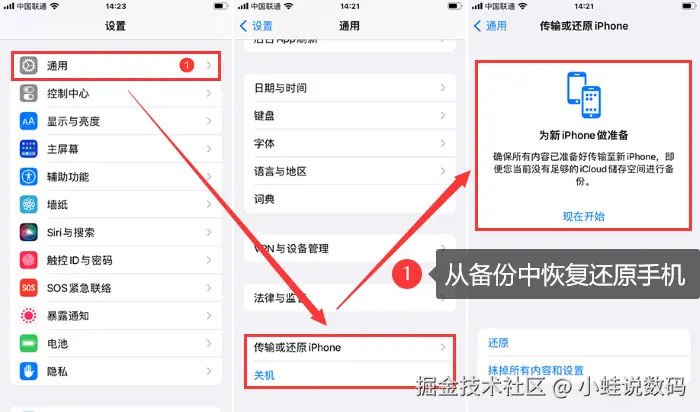 恢复步骤: 进入苹果手机的 【设置】 中,点击 【通用】 选项,通过 【传输或还原iPhone】 选项,选择从已有的备份中恢复还原手机,从而找回消失的照片。