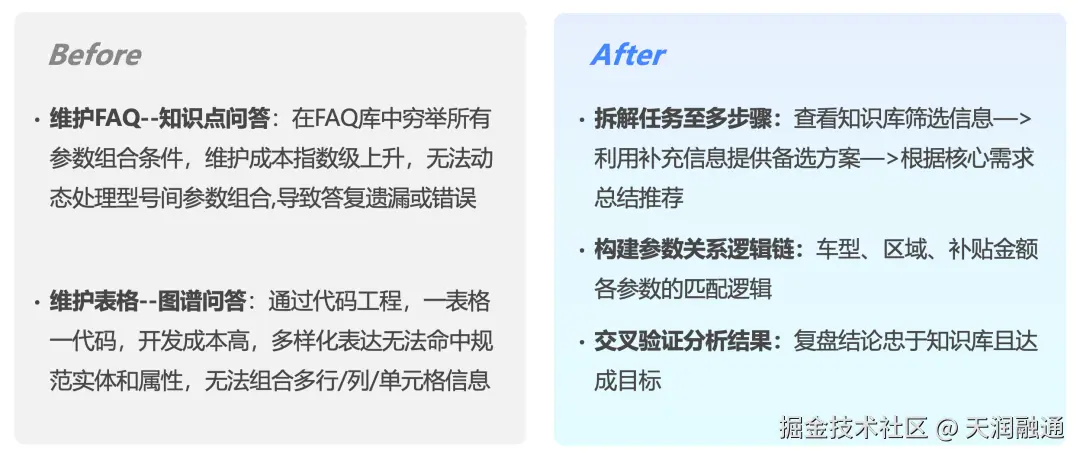 传统文本机器人无论是通过维护FAQ还是维护表格的方式,基本都不支持这样的复杂参数咨询。如果维护FAQ的话需要在FAQ库中穷举所有参数组合条件,维护成本指数级上升,依赖人工预设逻辑,无法动态处理型号间参数组合,导致答复遗漏或错误。