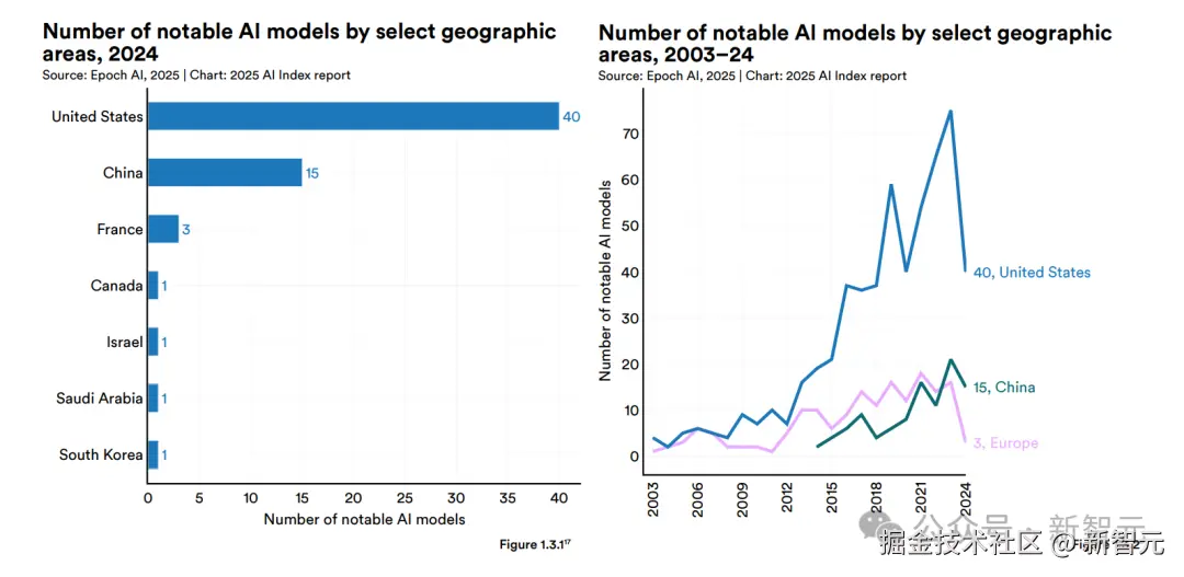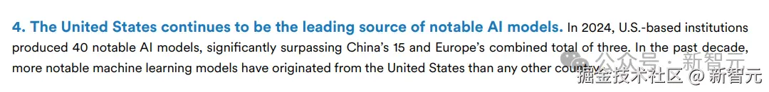 2024 年,美国产出 40 个重要 AI 模型,远超中国的 15 个和欧洲的 3 个。