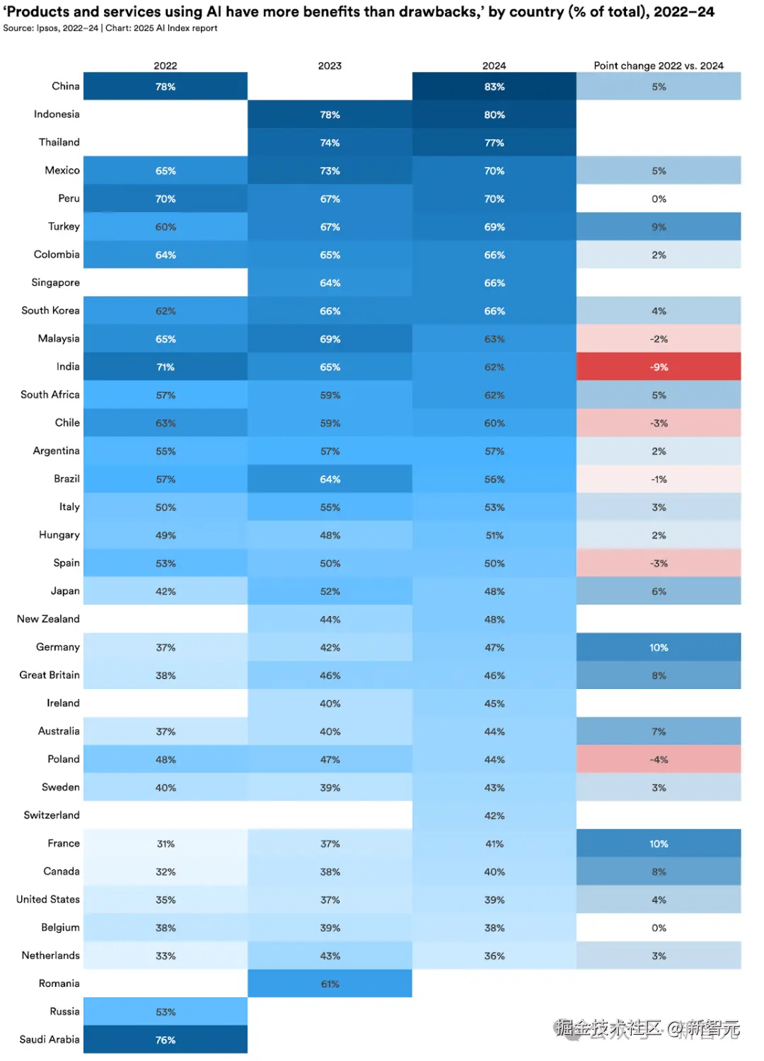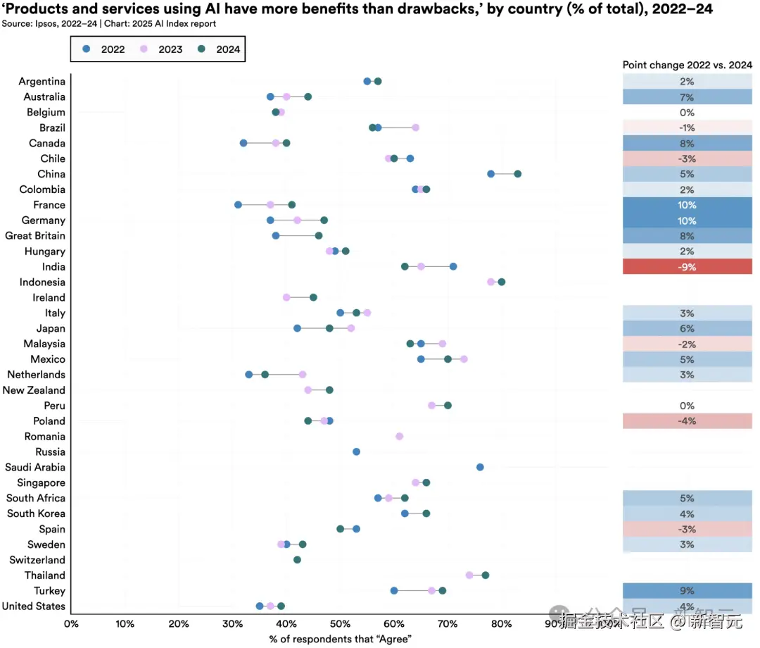 中国(83%)、印尼(80%)和泰国(77%)民众对 AI 持积极态度,而加拿大(40%)、美国(39%)等发达国家则相对保守。