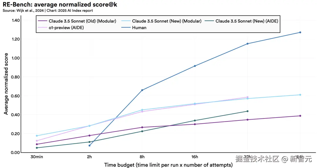 数据显示:在短期任务(2 小时内)场景下,顶级 AI 系统的表现可达人类专家的 4 倍;但当任务时限延长至 32 小时,人类则以 2:1 的优势反超。