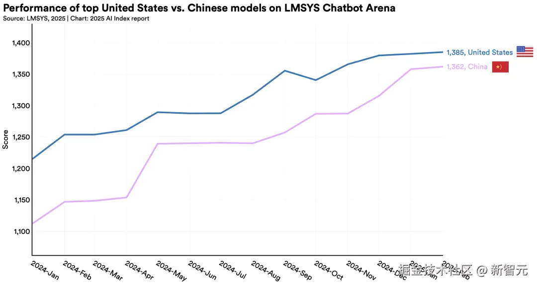 比如,如今在 2025 年,中美顶级 AI 模型的性能差距已经缩小到了 0.3%(2023 年,这一数字还是 20%),中国模型正在快速追赶美国的领先地位!