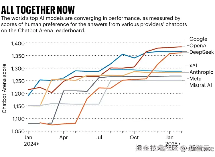 更明显的一个趋势,就是如今大模型的性能已经趋同!在 2024 年,TOP1 和 TOP10 的模型的差距能有 12%,但如今,它们的差距已经越来越小,锐减至 5%。