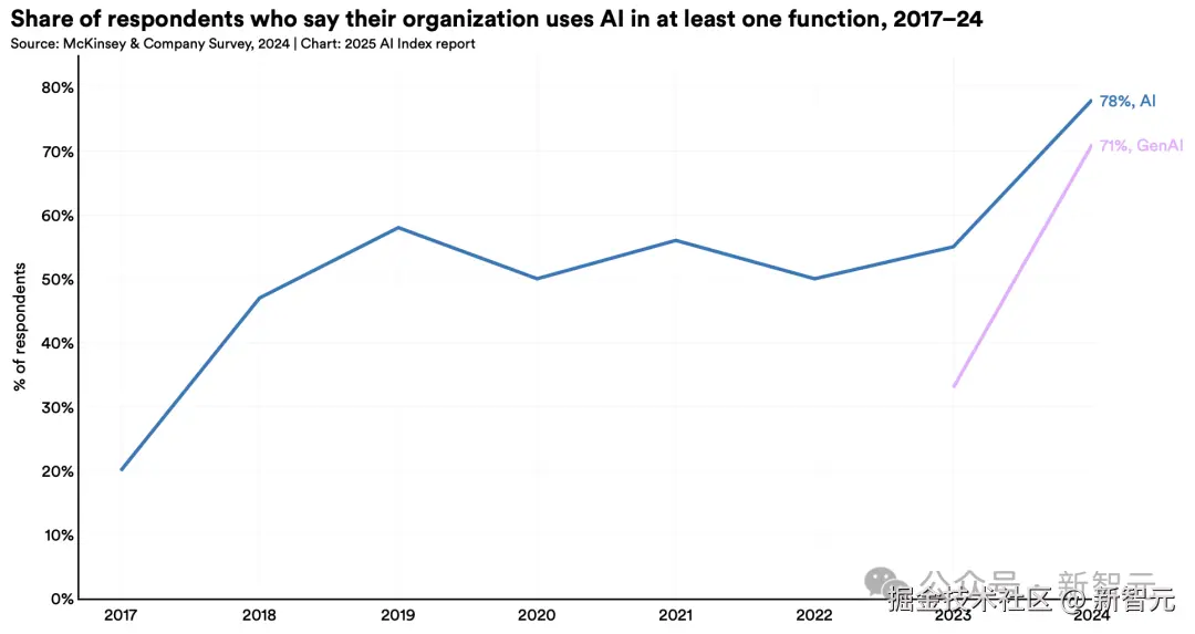 更引人注目的是,将生成式 AI 应用于至少一项业务职能的企业数量激增——从 2023 年的 33% 跃升至去年的 71%,增幅超一倍。