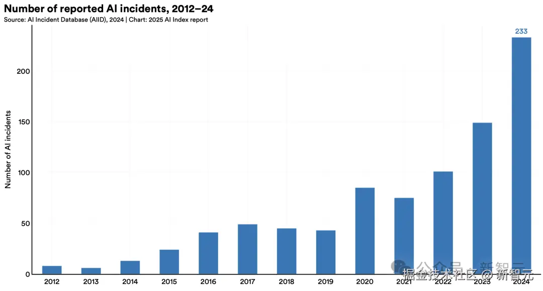 根据权威 AI 危害追踪数据库「AI 事件库」(AI Incidents Database)统计,2024 年全球 AI 相关危害事件激增至 233 起,创下历史新高,较 2023 年暴涨 56.4%。