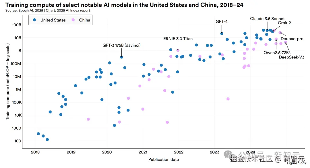 下图 1.3.17 比较了中国和美国知名 AI 模型的训练算力,揭示了一个重要趋势:美国的顶级 AI 模型通常比中国模型需要多得多的计算资源。