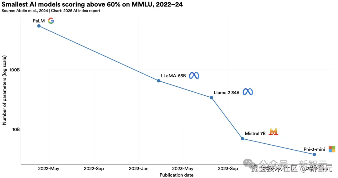 到了 2024 年,微软 Phi-3-mini 仅用 38 亿参数,就取得了同样的实力。
